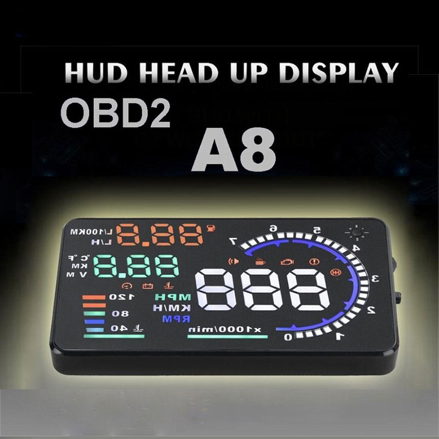 Mẫu màn hình HUD A8 có kích thước 5,5 inch, nặng 110g. Nội dung hiển thị trên màn hình bao gồm tốc độ xe, số vòng tua máy, quãng đường đã đi, mức nhiên liệu sử dụng, nhiệt độ két nước, mức điện áp,… Giá của mẫu màn hình này. là khoảng 800.000đ – 900.000đ.