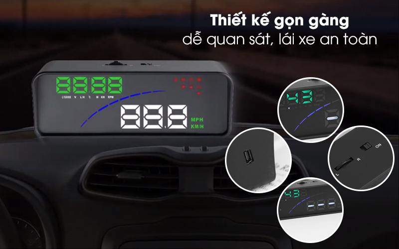 HUD A100 – mẫu màn hình hỗ trợ kết nối OBD. Kích thước màn hình đạt 3.5 inch, trọng lượng chỉ khoảng 40g, hoạt động ổn định trong môi trường có nhiệt độ từ -40 đến 80 độ C. Nội dung chính hiển thị trên màn hình bao gồm tốc độ, nhiệt độ bình chứa nước và mức điện áp. Giá tham khảo của mẫu HUD A100 là 500.000 – 600.000 đồng.